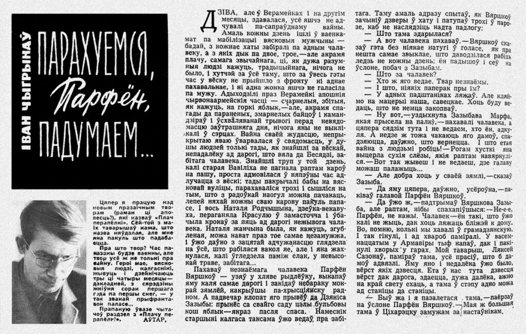 Чыгрынаў, І. Парахуемся, Парфён, падумаем… : раздзел з рамана «Плач перапёлкі» / Іван Чыгрынаў // Літаратура і Мастацтва. – 1967. – 17 сакавіка. – С. 2 ; 3 ; 4.