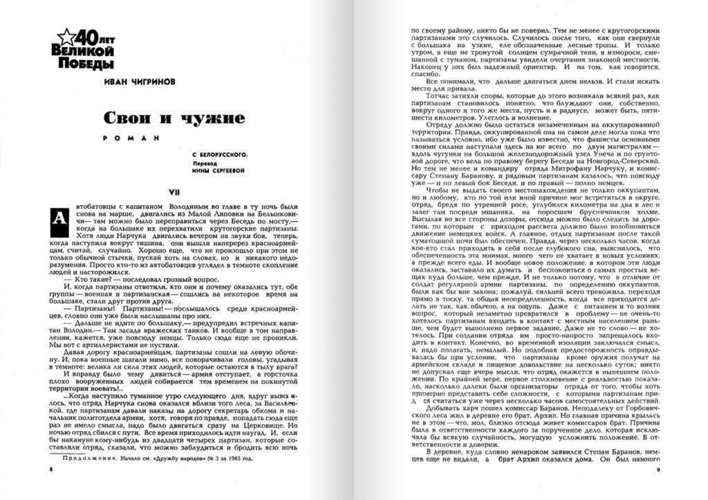 Чигринов, И. Г. Свои и чужие : роман / Иван Чигринов // Роман-газета. – 1987. – № 2 (1056). – С. 1–107.