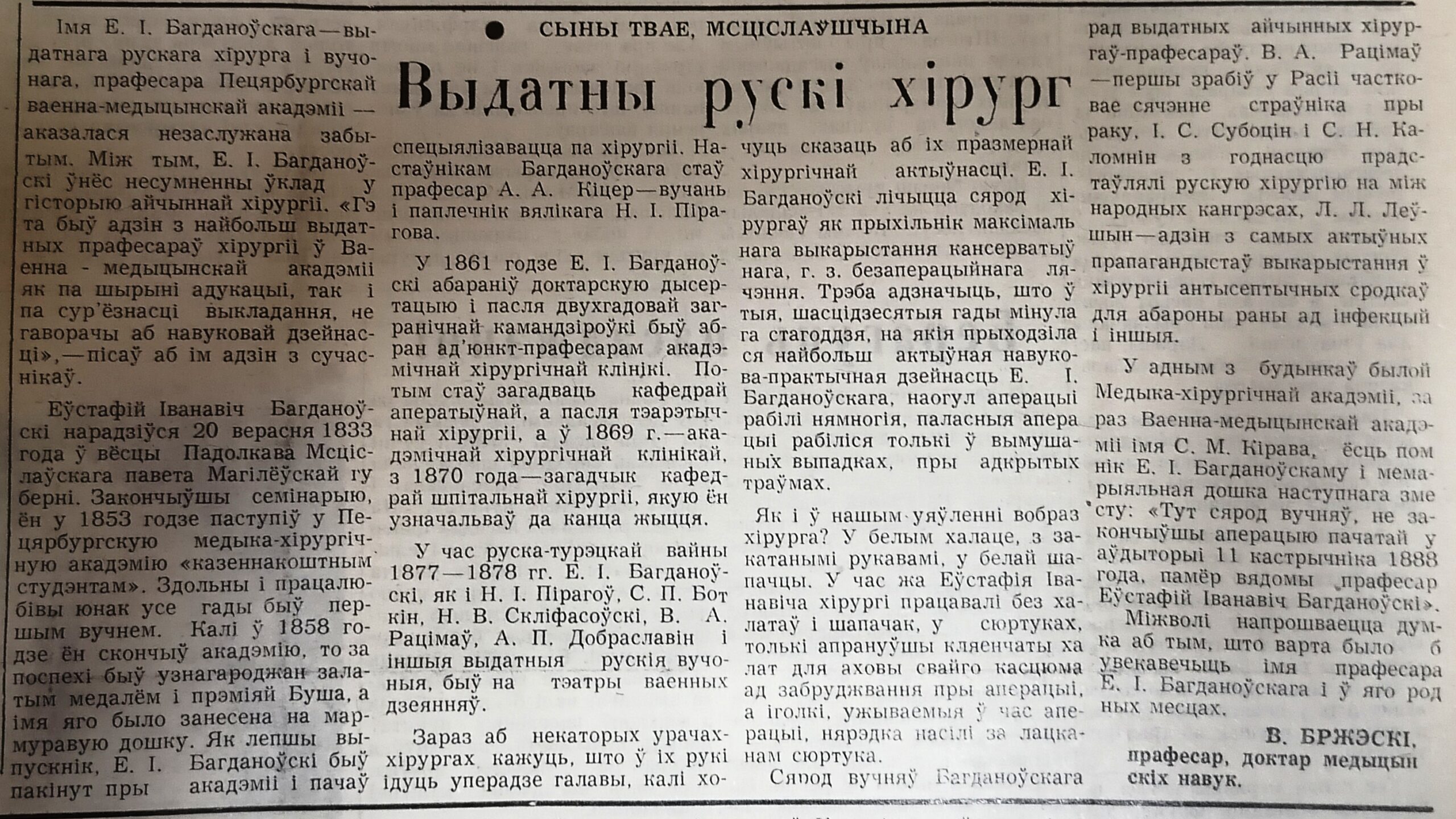 Бржэскі, В. Выдатны рускі хірург : [Яўстафій Багданоўскі] / В. Бржэскі // Святло Кастрычніка (Мсціслаў). – 1984. – 26 мая. – С. 3.
