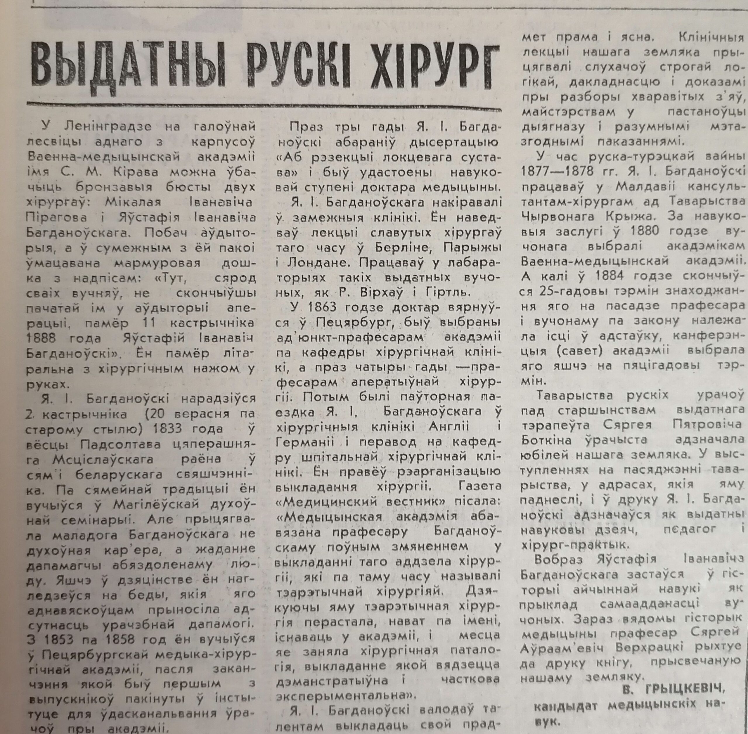 Грыцкевіч, В. Выдатны рускі хірург : [Яўстафій Багданоўскі] / В. Грыцкевіч // Магілёўская праўда. – 1983. – 12 лістапада. – С. 4.