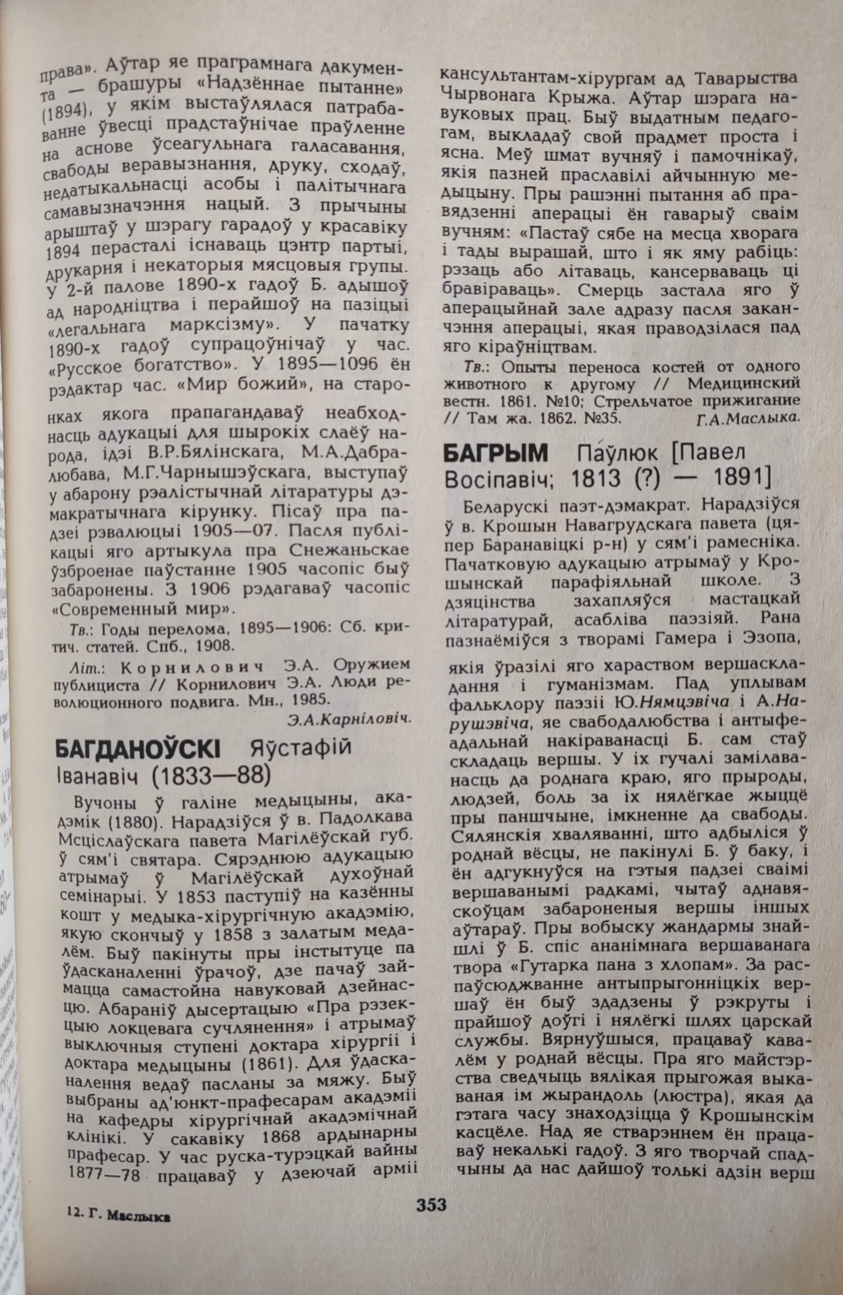 Маслыка, Г. А. Багданоўскі Яўстафій Іванавіч (1833–1888) / Г. А. Маслыка // Мысліцелі і асветнікі Беларусі : энцыклапедычны даведнік / [Б. І. Сачанка (галоўны рэдактар) і нш.]. – Мінск, 1995. – С. 353.