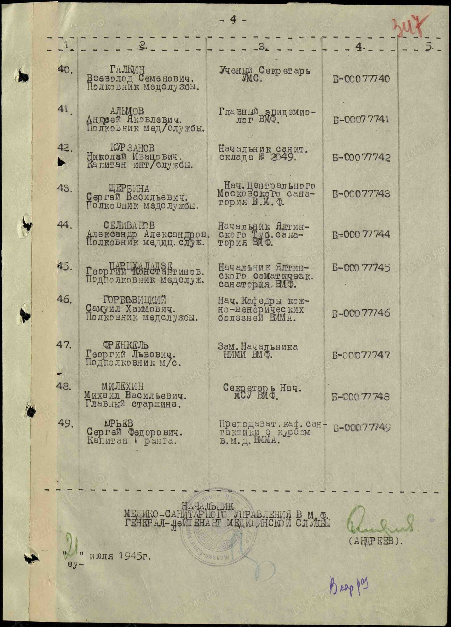 Одновременно с заведованием кафедрой в годы Великой Отечественной войны и в послевоенные годы являлся главным дерматологом при Медико-санитарном управлении Министерства Военно-морского флота СССР.