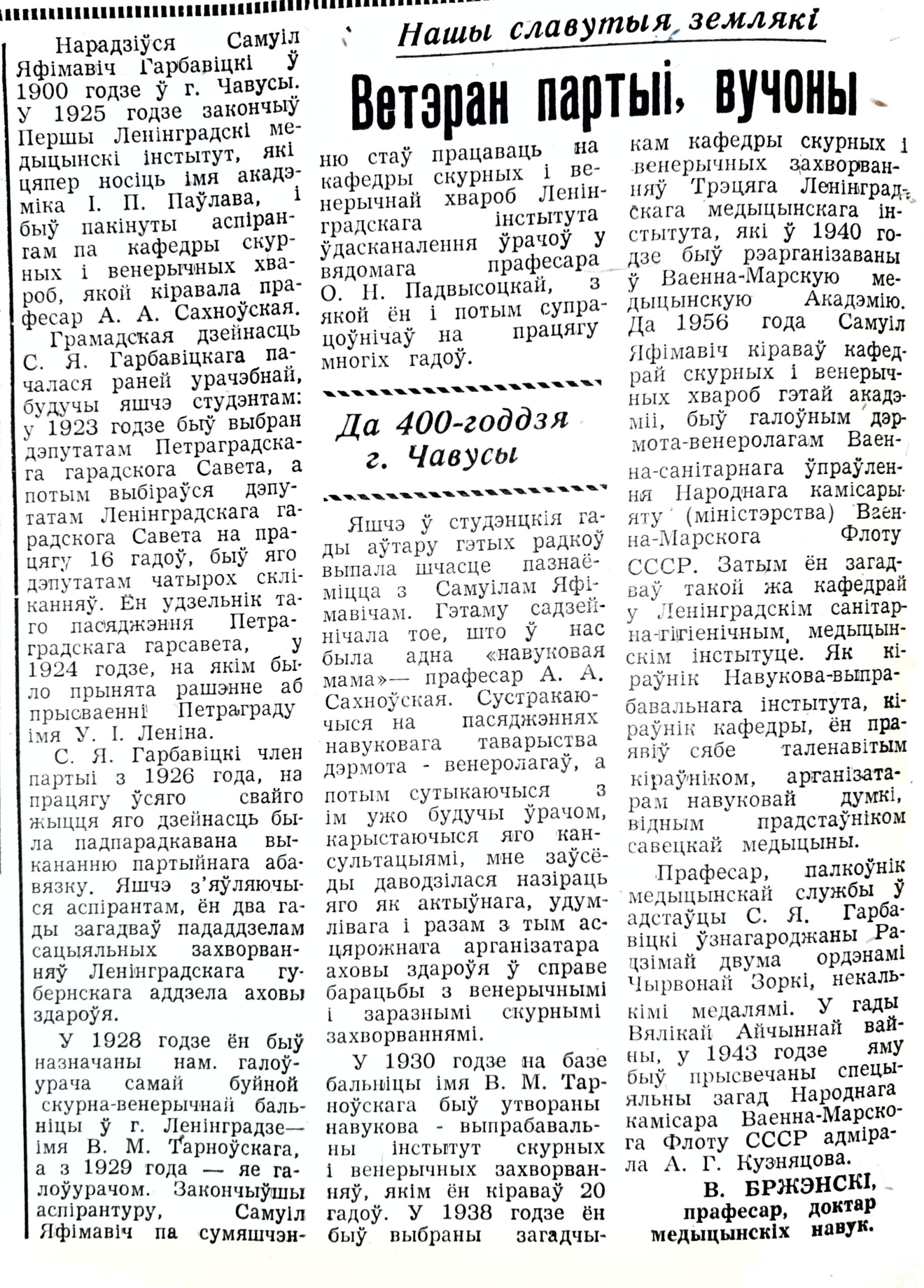 - Бржэўскі, В. Ветэран партыі, вучоны : Гарбавіцкі Самуіл Яфімавіч / В. Бржэўскі // Іскра (Чавусы). – 1981. – 30 ліпеня. – C. 2.