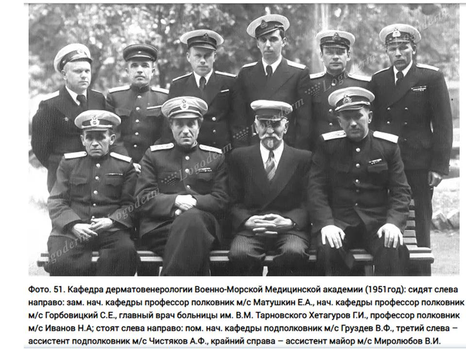 1940–1956 гг. – начальник кафедры кожных и венерических болезней Военно-медицинской академии Красной Армии им. С.М. Кирова (ФГБВОУ ВО «Военно-медицинская академия им. С.М. Кирова» Министерства обороны Российской Федерации, г. Санкт-Петербург, Российская Федерация). Подготавливал молодых ученых и специалистов дерматовенерологов Военно-морского флота.