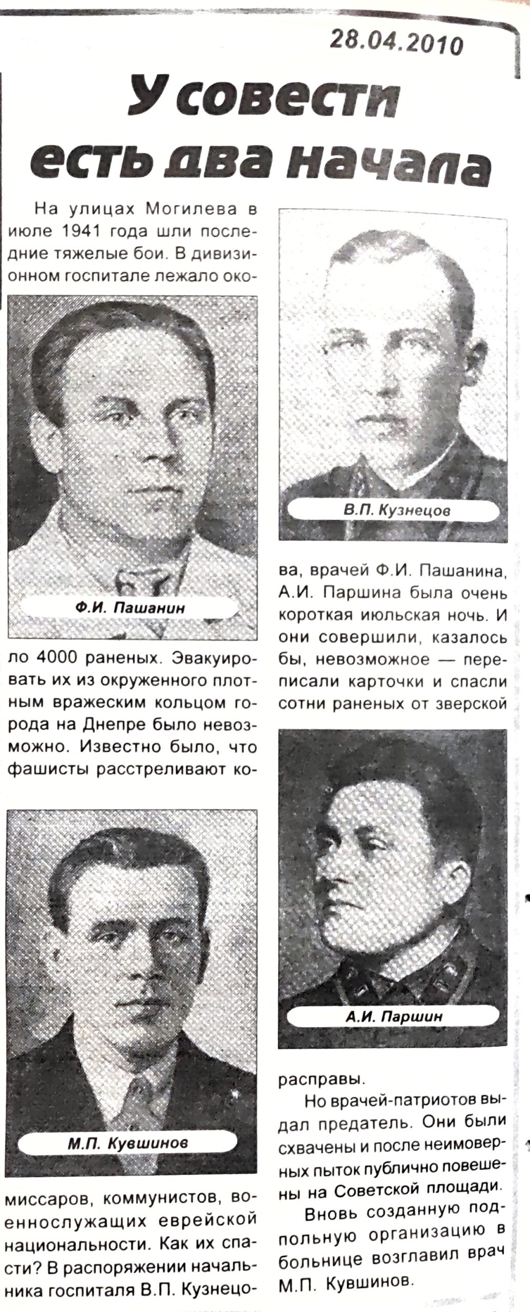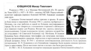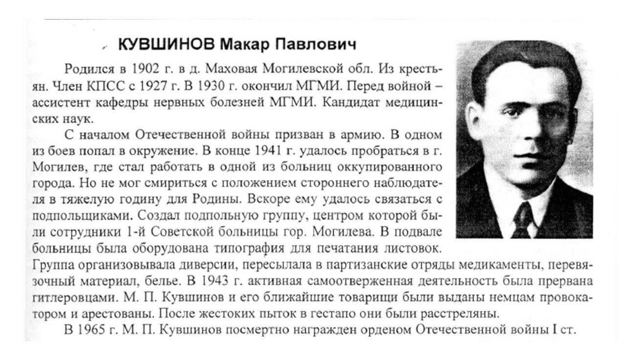 В 1942 г. организовал и возглавил подпольную организацию в 1-й Советской больнице г. Могилева (УО «Могилевская городская больница скорой медицинской помощи», г. Могилев, Республика Беларусь).