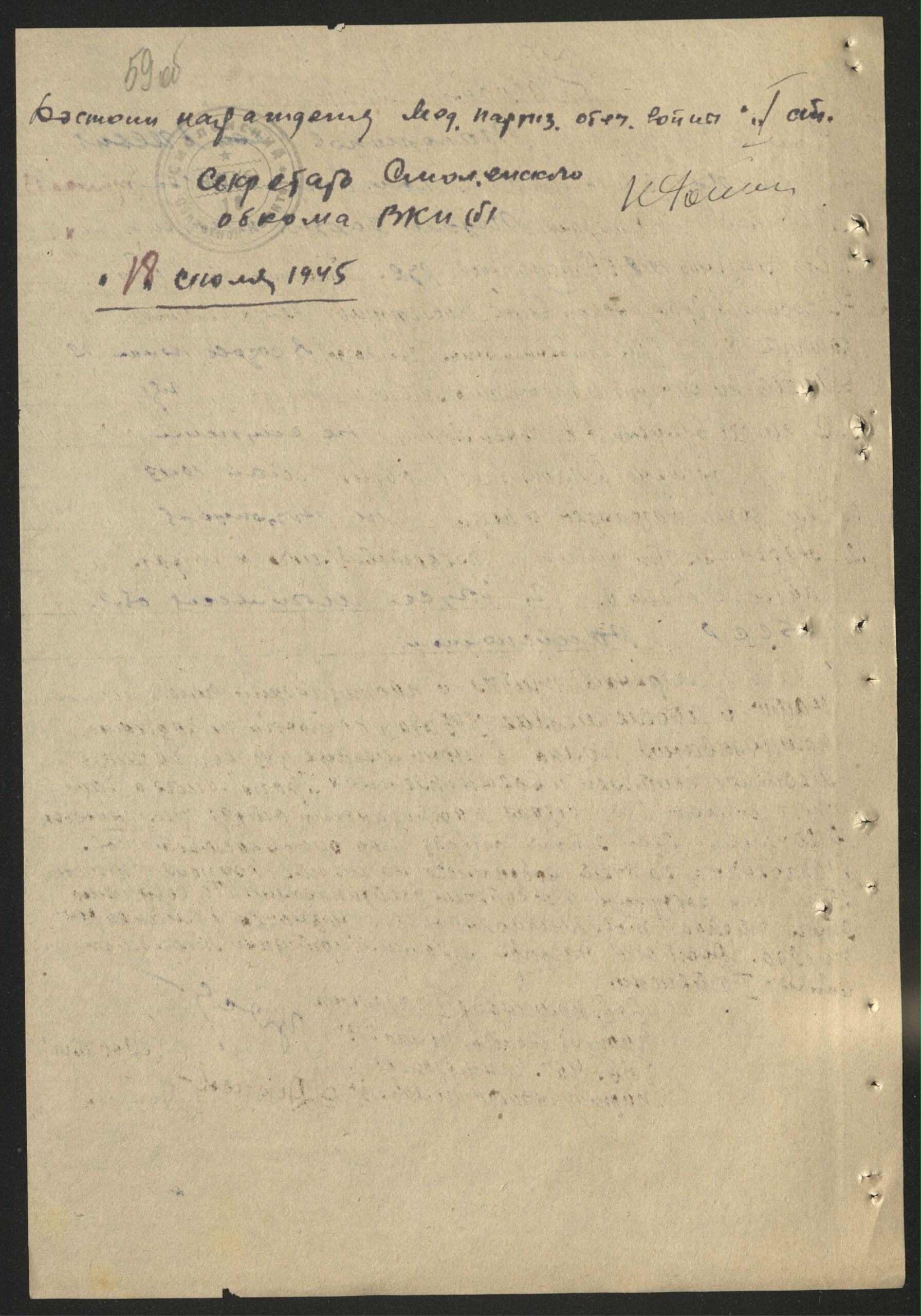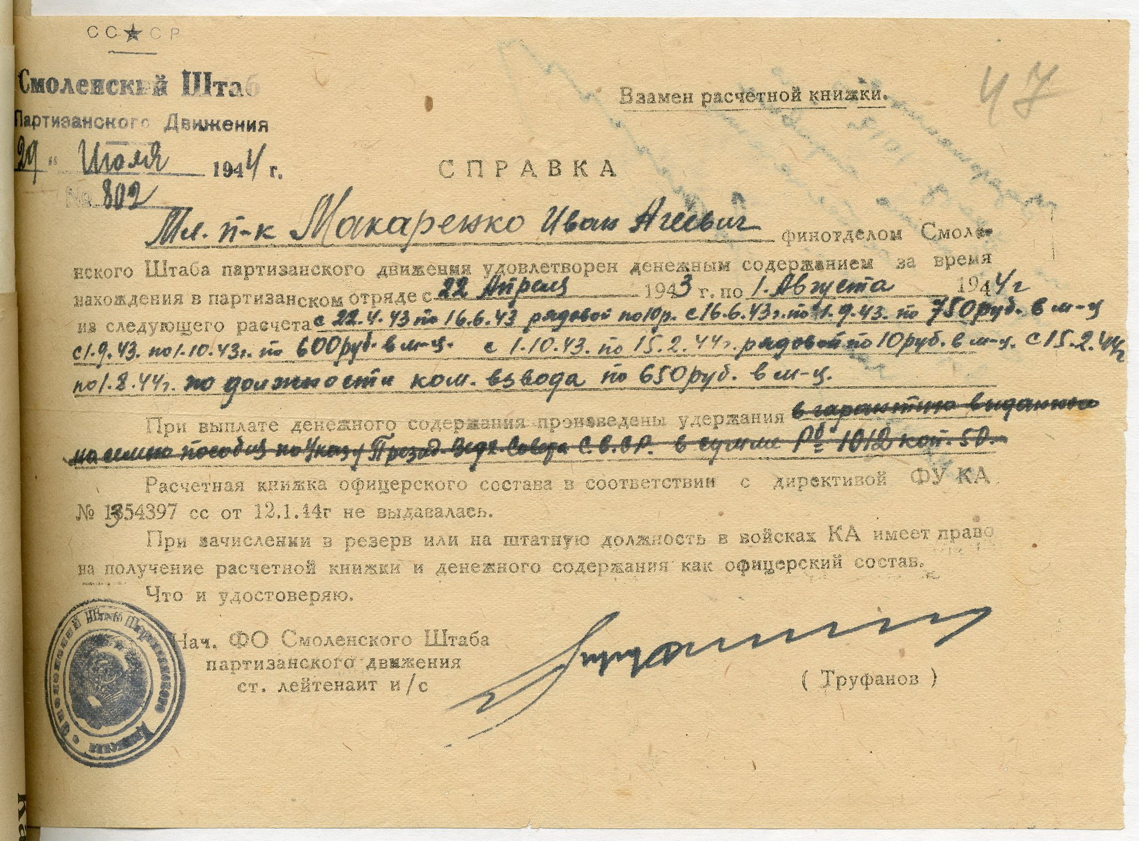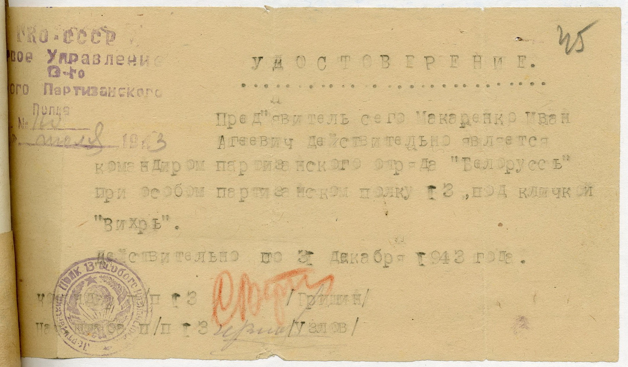 С 22 апреля 1943 г. по 28 июня 1944 г. – командир отделения партизанского полка «Тринадцать».