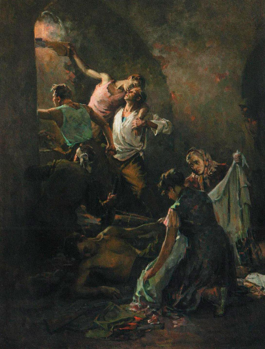 Ахрэмчык, І. В. Абаронцы Брэсцкай крэпасці, 1957–1958 : палатно, алей ; 265,5х209 см. Нацыянальны мастацкі музей Рэспублікі Беларусь. |