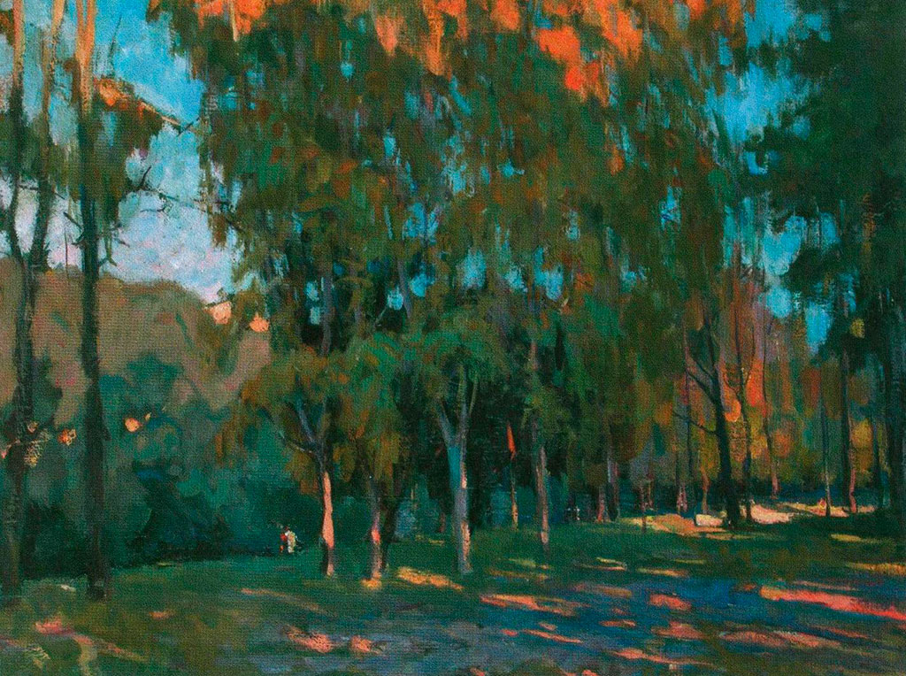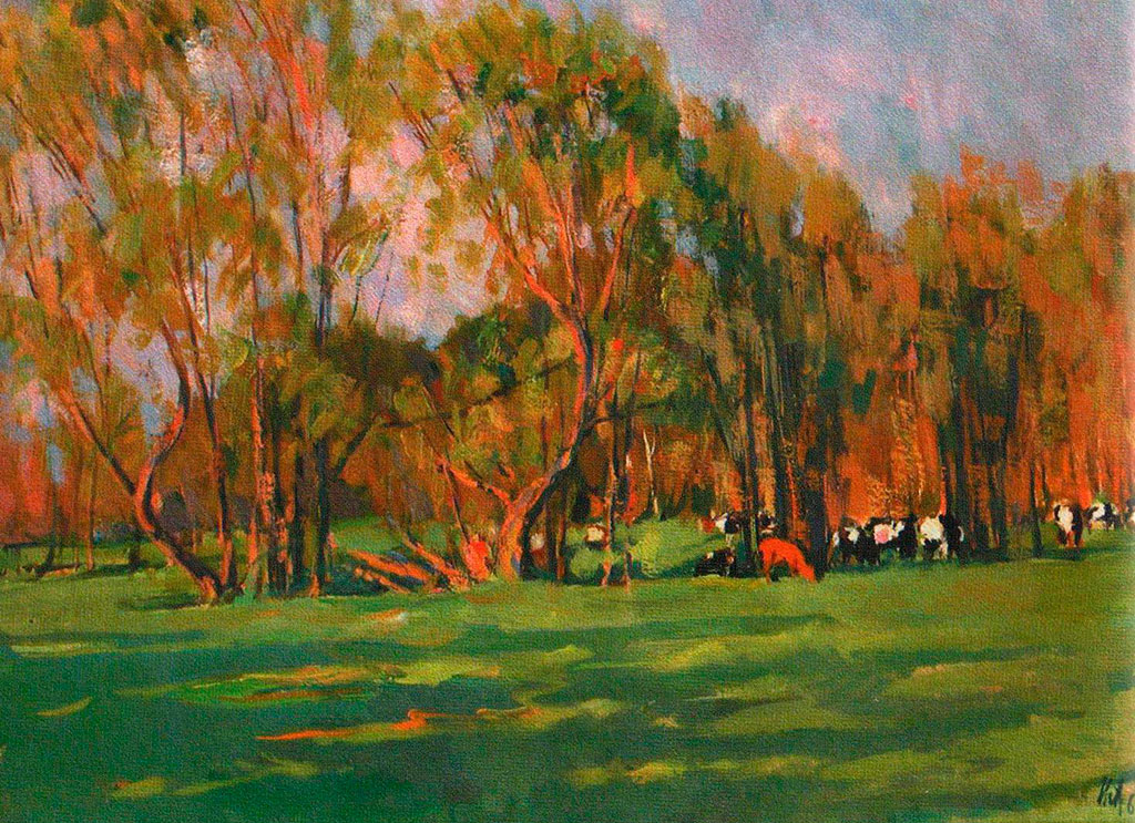 | Ахрэмчык, І. В. Промні заходу, 1968 : палатно, алей ; 60,1х80,5 см. Нацыянальны мастацкі музей Рэспублікі Беларусь. |